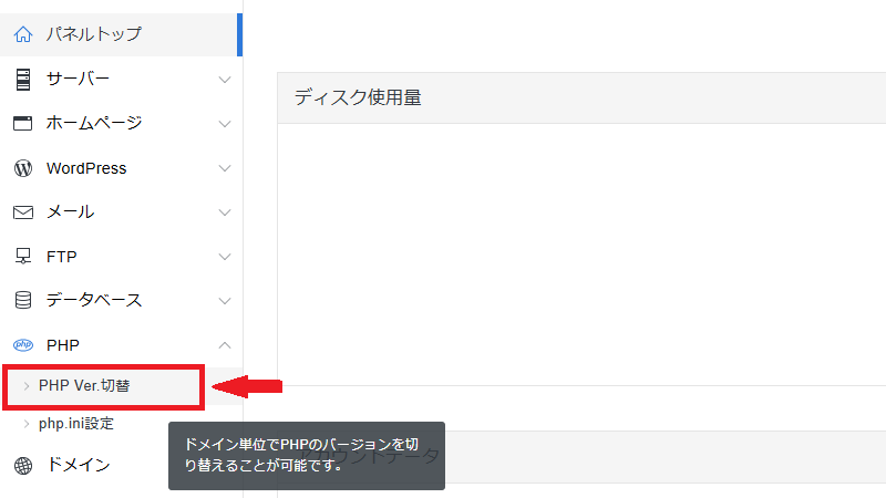 4.エックスサーバーのサーバーパネルが表示されるので、「PHP」→「PHP Ver.切替」をクリックします。