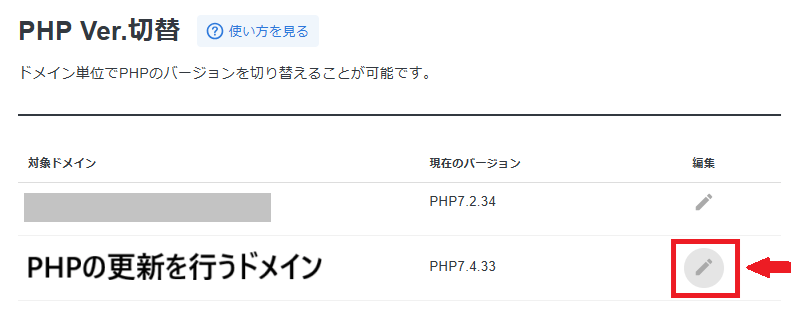 5.PHPの更新を行うドメインの横にある「編集」をクリックします。