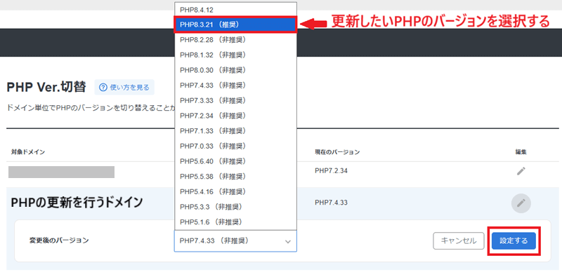 6.更新したいPHPのバージョンを選択→「設定する」をクリックします。