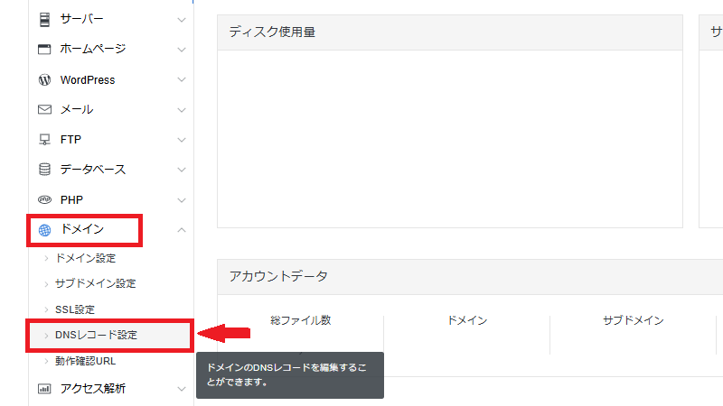 5.サーバーパネルトップページ「ドメイン」→「DNSレコード設定」をクリックします。