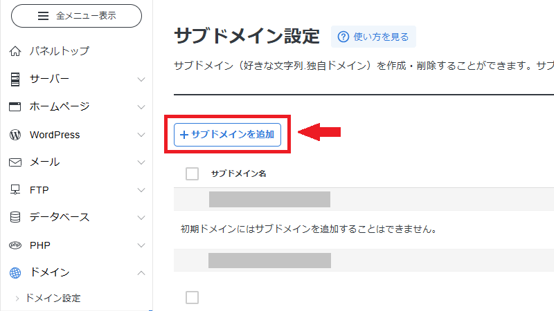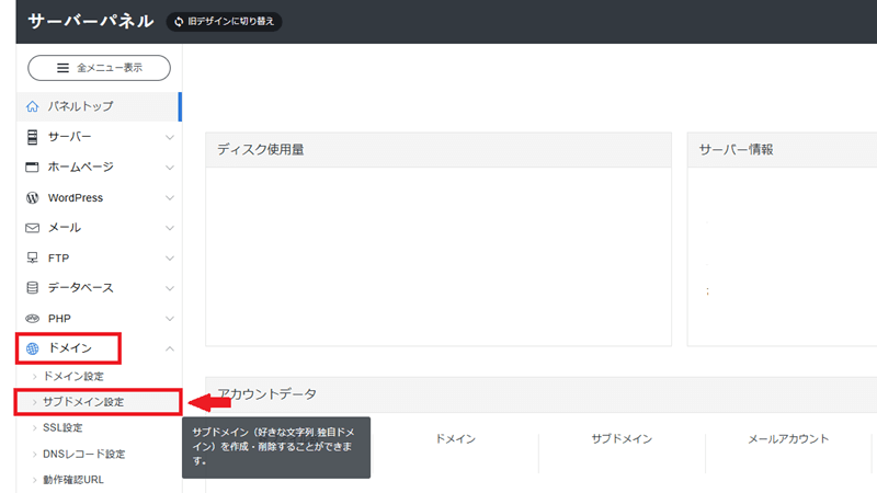 2.サーバーパネルトップページに移動するので、「ドメイン」→「サブドメイン設定」をクリックします。