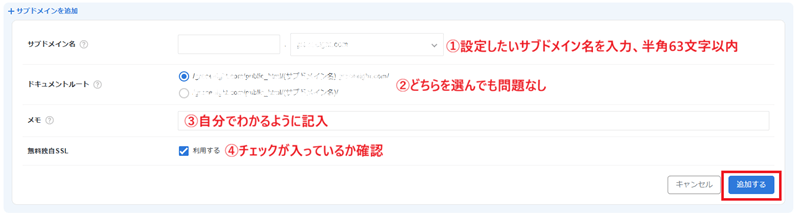 - サブドメイン名:設定したいサブドメイン名を入力、半角63文字以内