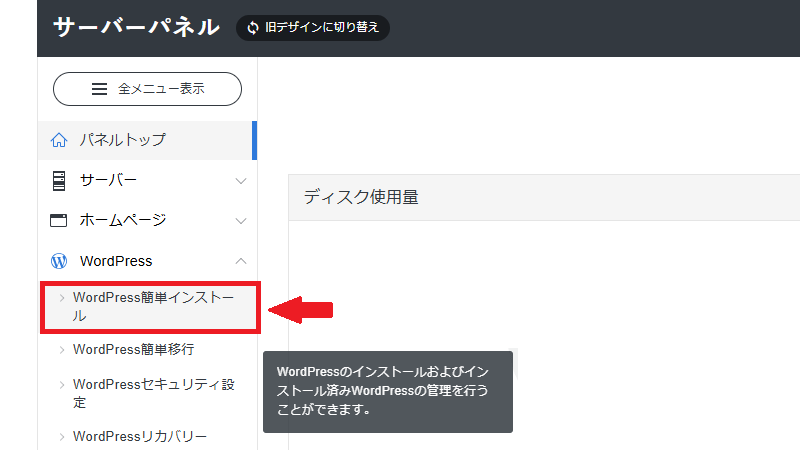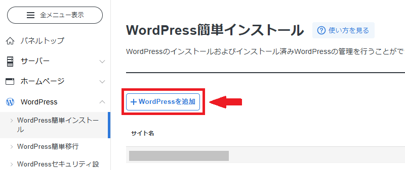 左サイドバー「WordPress」→「WordPress簡単インストール」をクリックします。