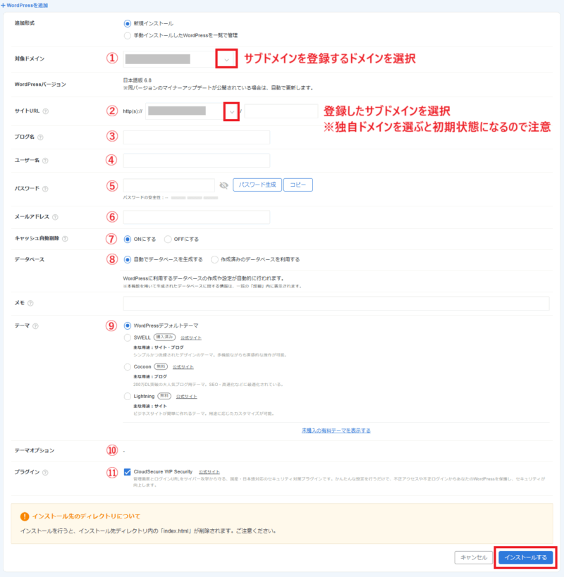 - サイトURL:プルダウンの中から登録したサブドメインを選択